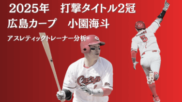 広島カープ小園海斗選手の2025年打撃2冠(首位打者.309・最高出塁率.365)獲得の理由を、日本スポーツ協会公認アスレティックトレーナーが身体能力から徹底分析。2024年との比較で判明した下肢筋群の飛躍的向上とトリプルスリーへの可能性を専門的に解説します。